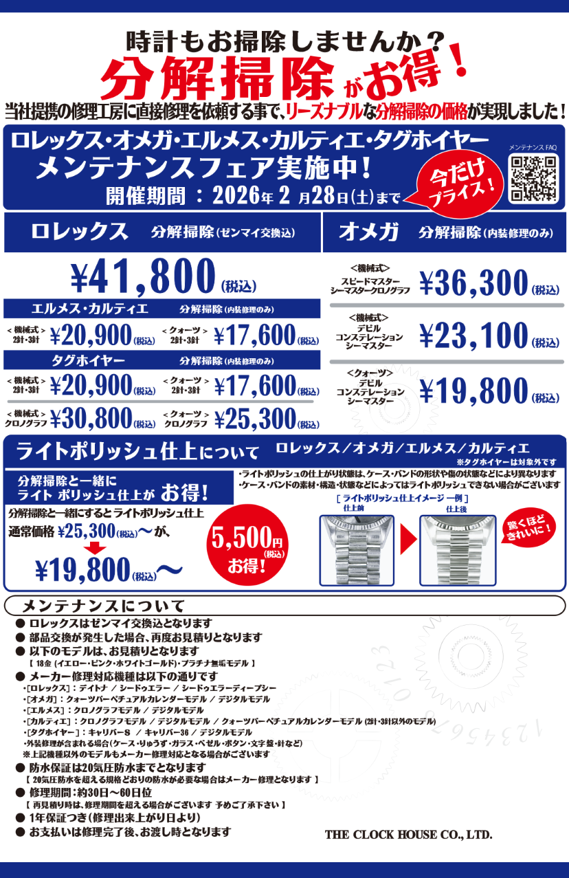 ロレックス・オメガ・エルメス・カルティエ・タグホイヤー メンテナンスフェア 今だけプライス!