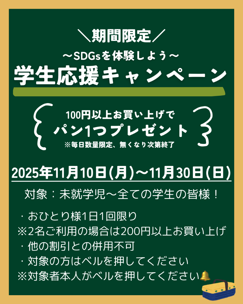 期間限定にて、未就学児~すべての学生の皆様対象に100円以上のお買い上げで前日焼成商品のパン1つプレゼント!