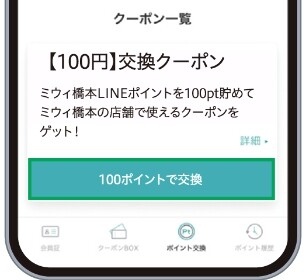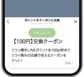 ミウィ橋本LINEポイントが100ポイント貯まったら、LINEのメニューより 【100円】交換クーポン に交換してください。